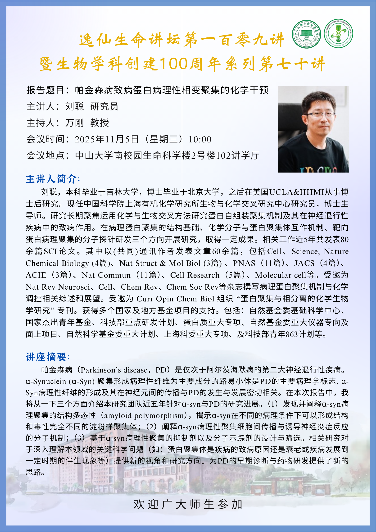 2025年11月5日免费成人直播 逸仙生命讲坛第109讲:帕金森病致病蛋白病理性相变聚集的化学干预