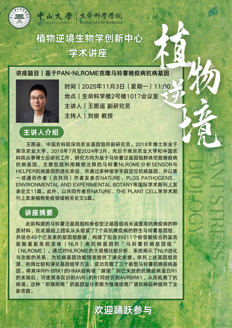 2025年11月3日免费成人直播 植物逆境生物学创新中心系列讲座:基于Pan-NLRome克隆马铃薯晚疫病抗病基因
